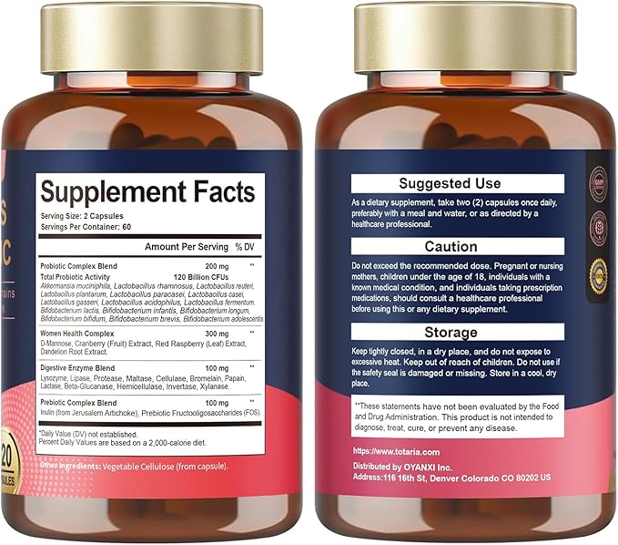 - Designed for Women’s Wellness: Totaria Probiotics for Women is formulated specifically for feminine digestive health and overall well-being. Each bottle contains 120 capsules, offering a full two-month supply with two capsules per serving for daily support. We offer a 3-month warranty. If our product falls short of your expectations, please contact us directly for a prompt solution
