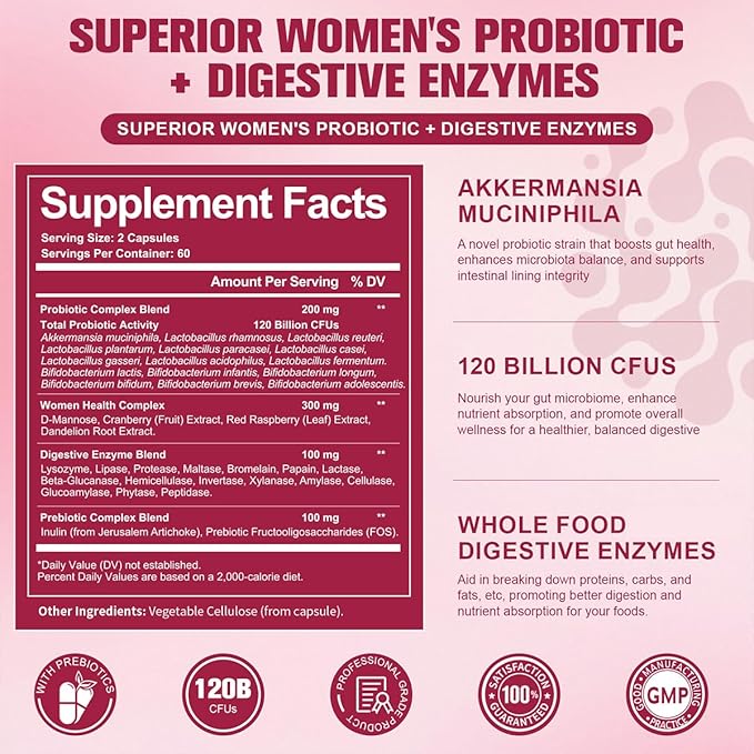 - Comprehensive Probiotics for Women: Contains 15 expertly crafted probiotics strains with 120 billion CFUs, including Lactobacillus & Bifidobacterium. Features Akkermansia muciniphila, a cutting-edge strain that strengthens the gut lining.