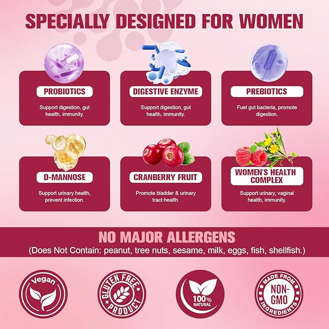 - Boosts Immunity & Vitality: A well-rounded blend of probiotics, prebiotics, digestive enzymes, and women’s health natural blends helps strengthen the immune system and improve vitality. Probiotics like L. rhamnosus and B. lactis support immune defense*. Digestive enzymes, including Lysozyme, Bromelain, and Papain, aid in nutrient breakdown and absorption, ensuring your body gets the most from your diet.