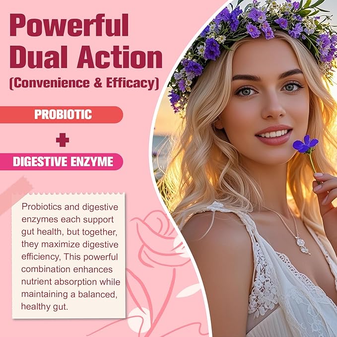 - Optimal Gut Health: A powerful combination of women probiotics, digestive enzymes and prebiotics, supports a balanced gut microbiome and enhanced digestion. utilizing the synergistic effect of the blends, the womens probiotic capsules help maintain a healthy gut lining and improves nutrient absorption. Water-soluble Prebiotics (Inulin & FOS) fuel beneficial bacteria* for maximum effectiveness. The Digestive Enzyme Blend, featuring Protease, Lipase, Bromelain and more, aids in breaking down proteins, fats, carbs, and fiber.