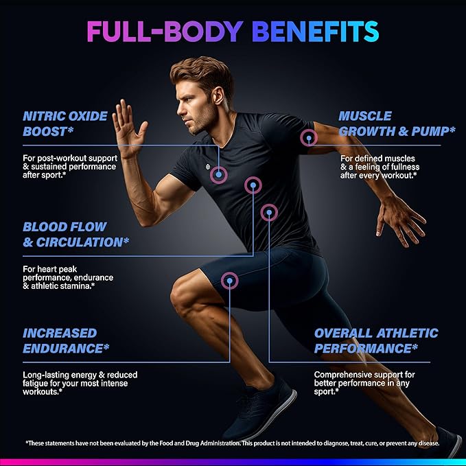 - Energy, Endurance & Circulation — built for total performance: boosts nitric oxide for enhanced blood flow and muscle pump, supports heart health during physical stress, and delivers lasting energy for peak endurance and performance drive. Designed for full-body athletic support — for every workout, every goal.