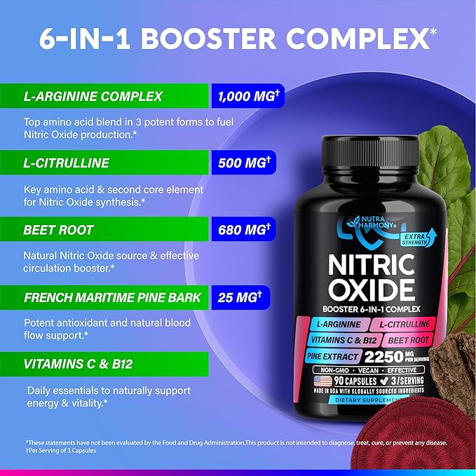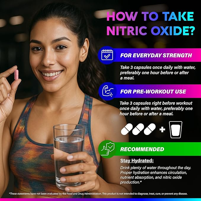- Nitric Oxide Booster — unleash your performance potential with a powerful blend designed to fuel your active lifestyle. This advanced formula helps amplify blood flow, muscular pump, and workout capacity — essential for athletes & fitness enthusiasts seeking maximum intensity, endurance, and strength gains. Built for sport. Made for results.