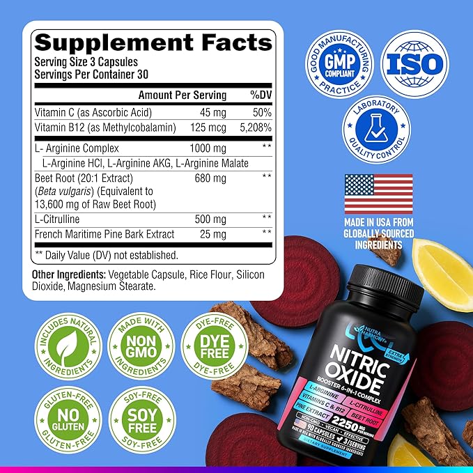 - 6-in-1 Complex 2250mg — experience the synergy of performance-focused ingredients: L-Arginine Complex (HCl, AKG, Ketoisocaproate), L-Citrulline, Beet Root, French Maritime Pine Bark, Vitamin C & B12. This comprehensive blend works in harmony to ignite nitric oxide production, support circulation, and energize your every rep.