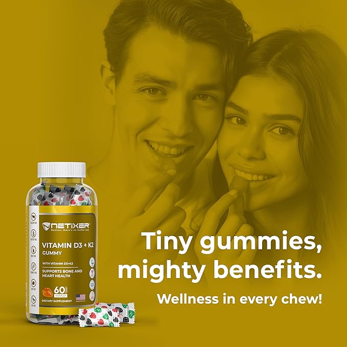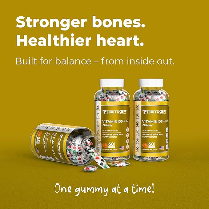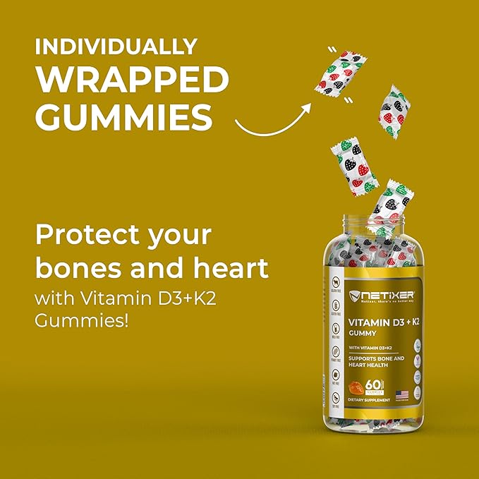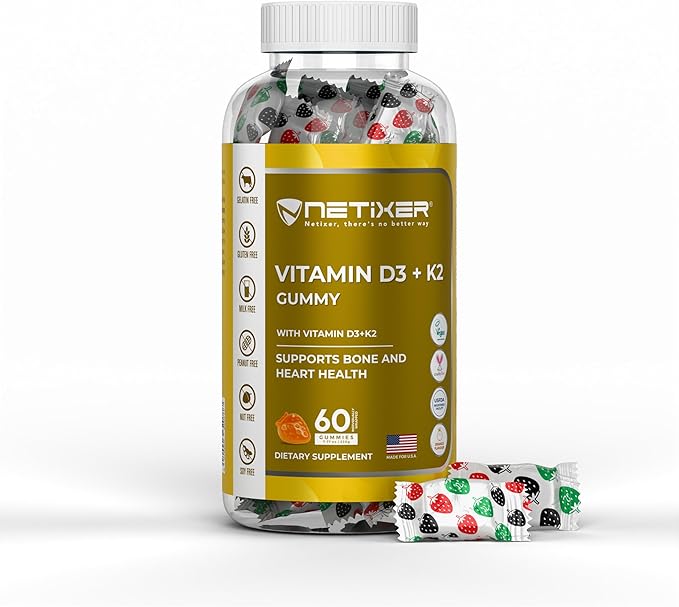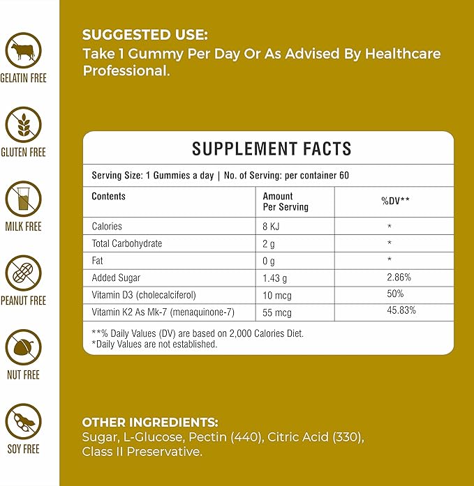 Vitamin D3 + K2 Gummies β Bone & Heart Support β with 10 mcg D3 (Cholecalciferol) & 55 mcg MK-7 K2 β Vegan, Gluten-Free, Gelatin-Free β Orange Flavor β Non-GMO β 60 Gummies β Allergen-Free