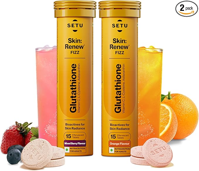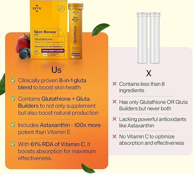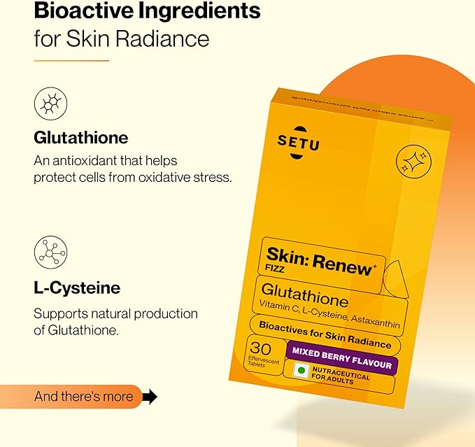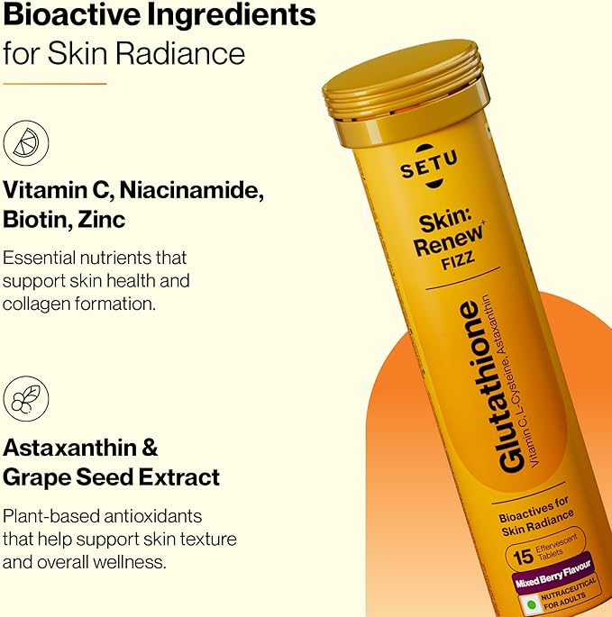 - 𝟴-𝗜𝗡-𝟭 𝗕𝗟𝗘𝗡𝗗 𝗢𝗙 𝗦𝗘𝗧𝗨 𝗦𝗞𝗜𝗡 – Setu Skin: Renew combines 500 mg of glutathione with vitamin C, L-cysteine, astaxanthin, niacinamide, biotin, zinc, and grape seed extract to provide daily antioxidant support and essential nutrients. These effervescent tablets dissolve quickly in water for convenient use and help maintain the normal function of skin as part of a balanced wellness routine.