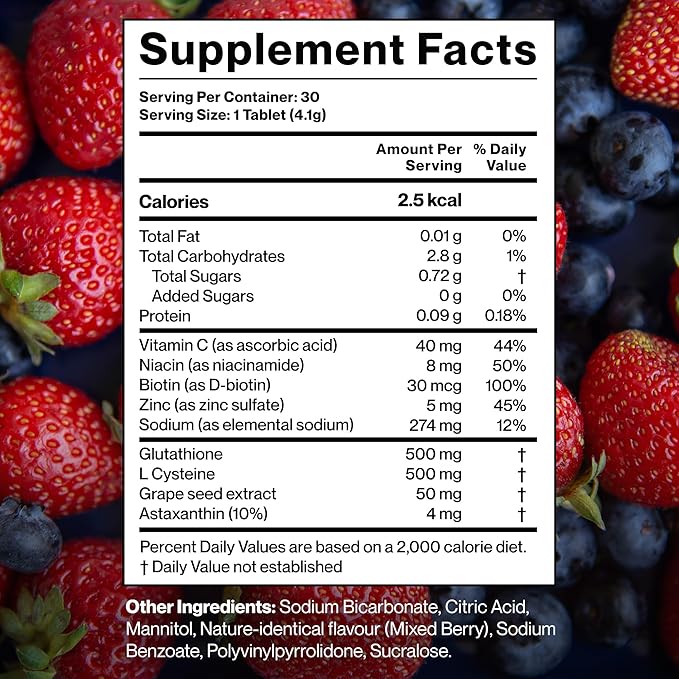 Glutathione Effervescent Tablets for Skin with 500mg L-Glutathione & Vitamin C | Sugar-Free Antioxidant Supplement for Clear, Glowing Complexion | Mixed Berry & Orange (Pack of 2) | 30 Tablets