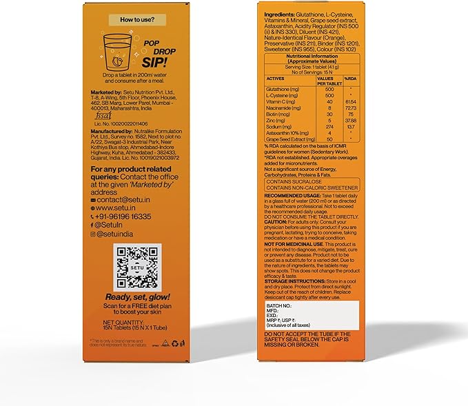 - 𝗝𝗨𝗦𝗧 𝗣𝗢𝗣, 𝗗𝗥𝗢𝗣 𝗔𝗡𝗗 𝗦𝗜𝗣!: Simply dissolve one Setu Glutathione Effervescent Tablet in 200 ml of water and enjoy it after breakfast. This refreshing combination of glutathione and vitamin C supports your daily antioxidant needs. For best results, make it part of your everyday wellness routine.