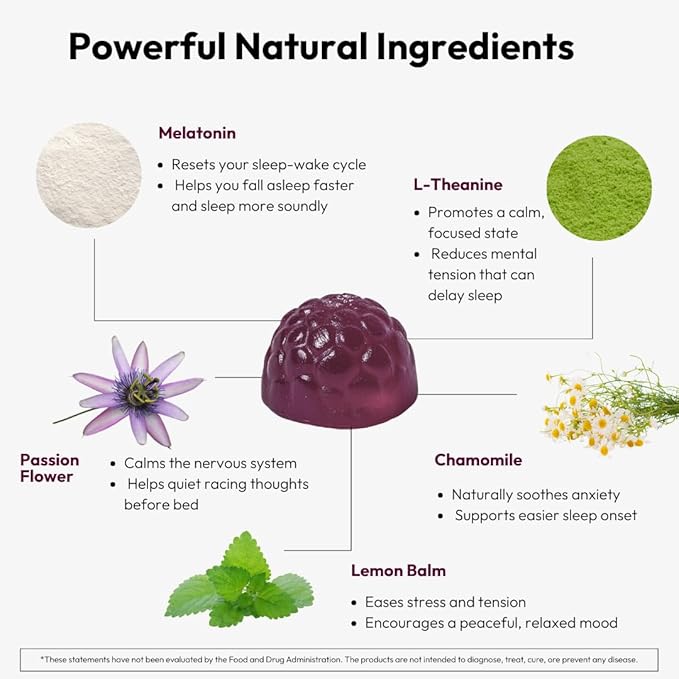- Clean, Plant-Based Ingredients: Crafted with natural, non-habit-forming ingredients—no artificial fillers. Vegan, non-GMO, and free from common allergens, so you can sleep better with peace of mind.