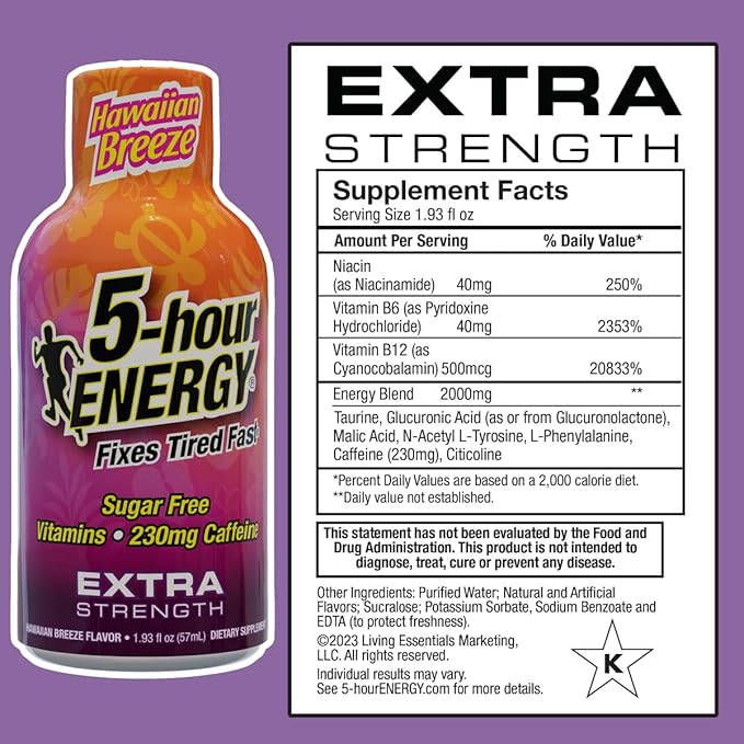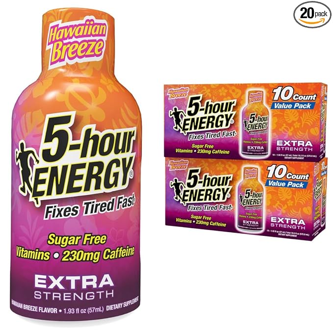 5-hour ENERGY Extra Strength Hawaiian Breeze Energy Shot 1.93oz, 20-Pack – Sugar Free Caffeine Energy Booster with B-Vitamins & Amino Acids – Zero Calorie