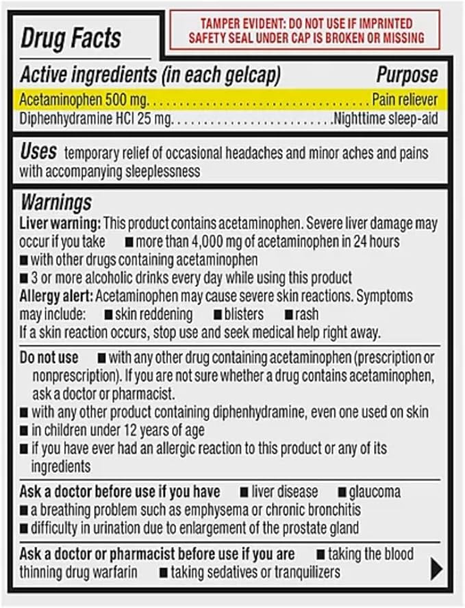 - One 375 count bottle of Acetaminophen PM gelcaps - Relieves headache and minor aches & pains accompanied by sleeplessness Each gelcap contains 500 mg of Acetaminophen and 25 mg of Diphenhydramine Hcl