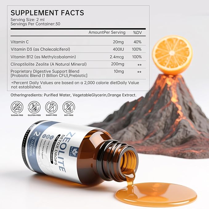 - Natural Zeolite: Zeolite is a pure natural mineral formed after a long period of precipitation after contact between magma and groundwater. Our zeolite drops are meticulously crafted with 99%+ pure zeolite, offering exceptional purity and quality. This premium formulation helps maintain overall health and supports the body's natural balance.