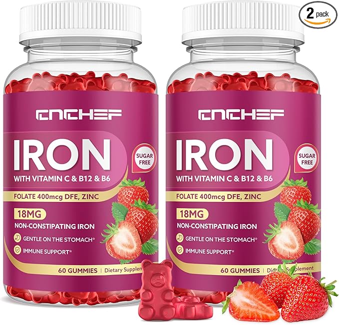 - ADVANCED IRON ABSORPTION & DAILY ENERGY BOOST: CNCHEF Iron Gummies feature highly bioavailable Ferrous Bisglycinate Chelate (18mg per serving, 100% DV) paired with 90mg Vitamin C to maximize iron uptake and oxygen transport. Gently supports healthy hemoglobin levels without stomach discomfort, constipation, or metallic aftertaste. Ideal for combating fatigue in children, menstruating women, pregnant/nursing moms, athletes, and vegetarians seeking a fuss-free iron supplement