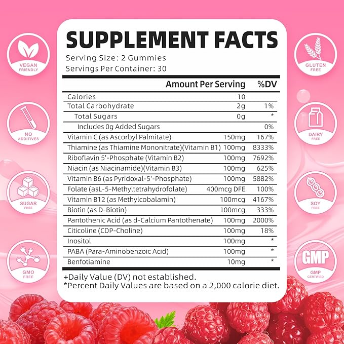 2 Pack Vitamin B Complex Gummies, All B Vitamins + Methyl B12, B1, B2, B3, B5, B6, Biotin, Methylfolate, Vitamin C, Choline, Inositol, PABA for Energy & Immune Support, Raspberry, 120 Count