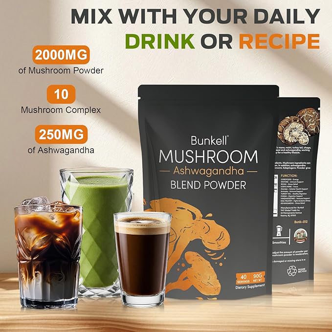 - Easy to Brew: The form of Bunkell mushroom powder is instant mushroom powder, just take 2/3 tsp(2.25g) mushroom powder into your coffee, tea, smoothies or recipes. If you like ice or hot mushroom drink, also add ice cubes or brew it with hot water. The natural mushroom ingredients are very suitable for vegetarians. Drinking mushroom powder everyday for a healthy lifestyle.