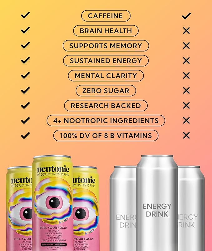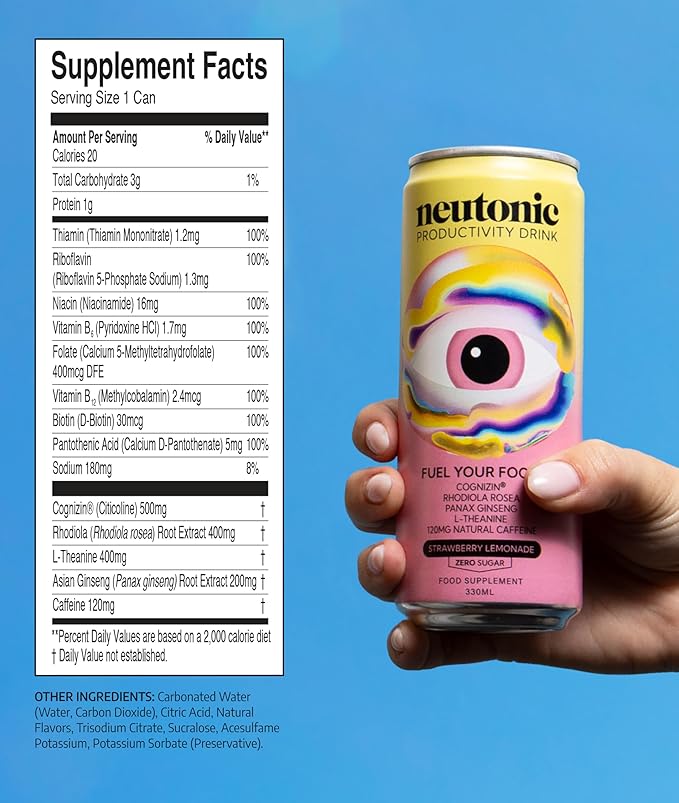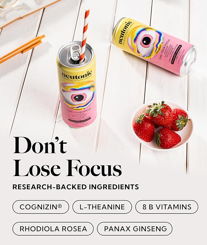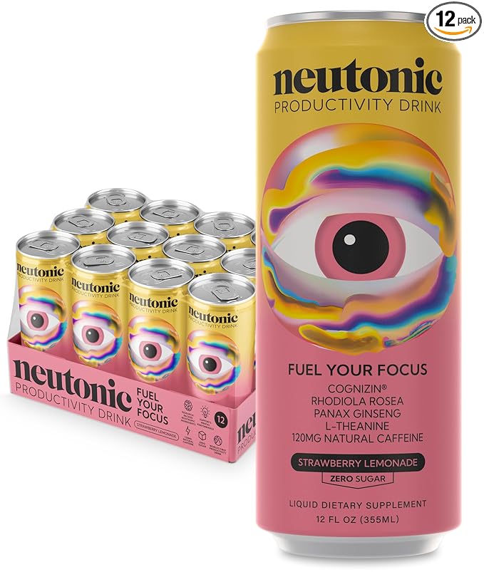 Neutonic Nootropic Productivity Energy Drink | Strawberry Lemonade 12 Cans | 120mg Natural Caffeine, Zero Sugar | Support Memory, Mental Clarity, Cognitive Function | Boost Focus, Energy, Brain Health