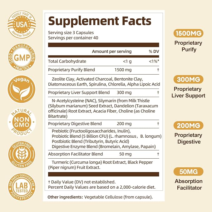 - 2000MG Powerful Detox: Contains 7 natural detoxifying ingredients including Zeolite Clay, Activated Charcoal, Bentonite Clay, Diatomaceous Earth, Spirulina, Chlorella, Alpha Lipoic Acid, which efficiently Toxin Flush.