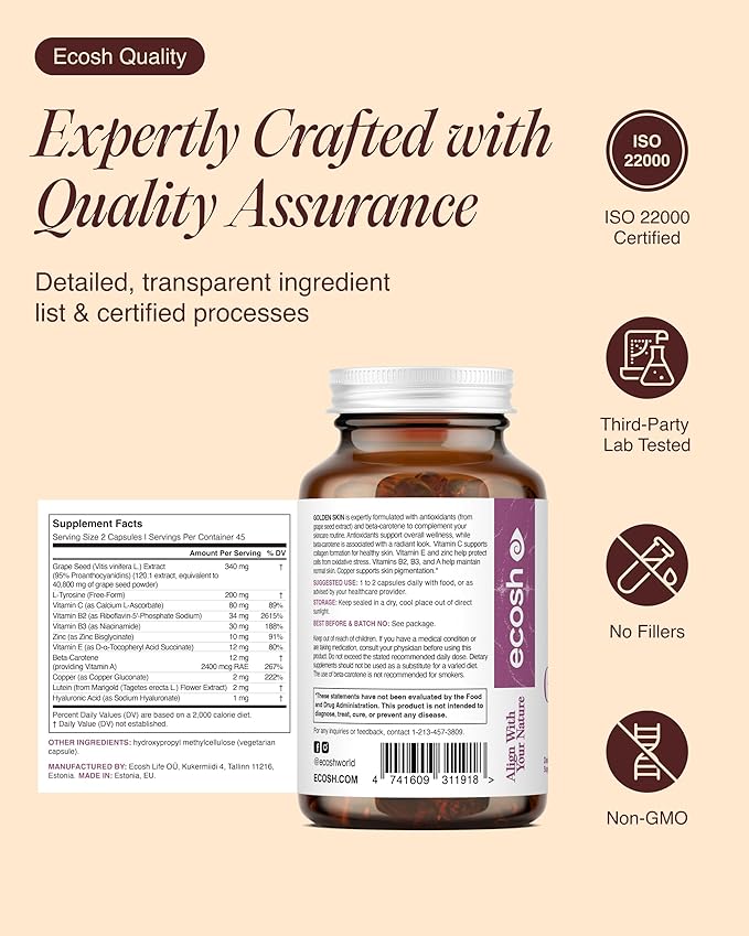 - SUPPORTS HEALTHY PIGMENTATION & SKIN TONE – With beta-carotene and L-tyrosine, Golden Skin supports healthy skin pigmentation and skin elasticity for an even, sun-kissed look. Antioxidants also support the skin’s natural defenses against environmental stressors to help maintain a calm, healthy-looking complexion.*