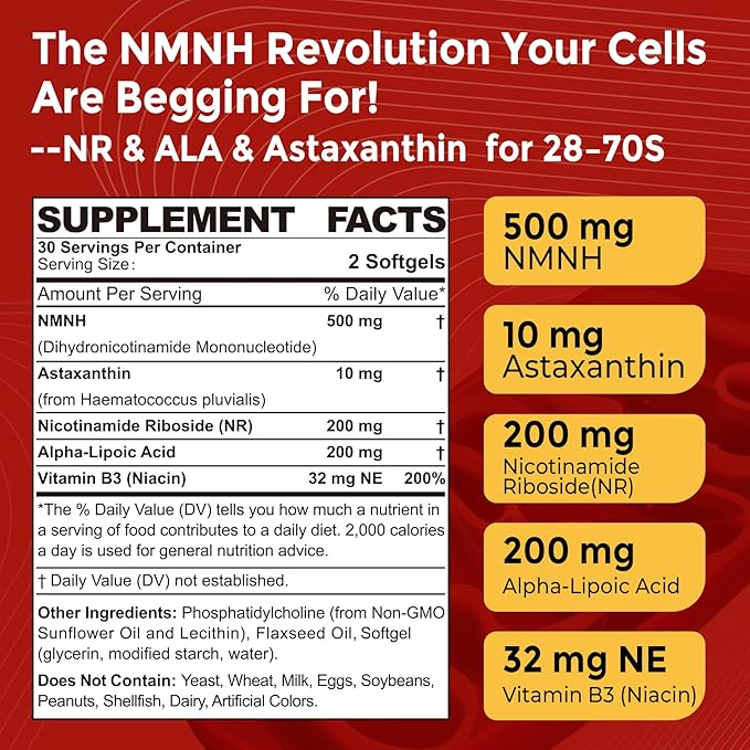 - [Time Travel Now Available in Softgel Form] Your birthday is lying. With NMNH, we’re hacking circadian aging at the molecular level. Astaxanthin reverses ✿xidative like a undo button, while ALA reprograms metab✿lism like a Silicon Valley coder. Astaxanthin’s 6,000x stronger than vitamin C at crushing free radicals. Results? "Younger DNA methylation patterns help optimize function day after day, supporting healthy NAD+ levels, antioxidant, and metab✿lic function.