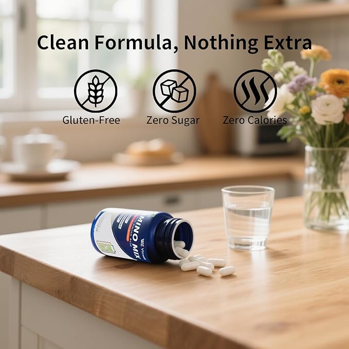 - 【COMPLETE AMINO ACID FORMULA】Vicwell Amino Acid features a comprehensive blend of 11 amino acids, including branched-chain amino acids (BCAAs) and essential amino acids (EAAs), to support your daily nutritional needs. Each serving delivers 1700mg of premium amino acids in convenient, easy-to-swallow capsules—an efficient way to fuel your active lifestyle.*