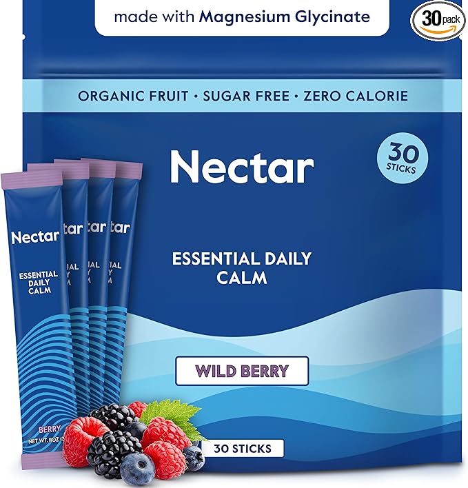 Nectar Calm Magnesium Glycinate Drink Mix - Sugar Free & Zero Calorie - with Organic Ashwagandha, Vitamin D, L-Theanine, Hydrating Electrolytes - Relax, Focus & Calm - Non-GMO (Berry 30 Sticks)