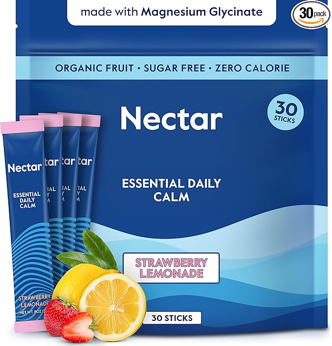 Nectar Calm Magnesium Glycinate Drink Mix - Sugar Free & Zero Calorie - with Organic Ashwagandha, Vitamin D, L-Theanine, Hydrating Electrolytes - Relax, Focus & Calm (Strawberry Lemonade 30 Sticks)