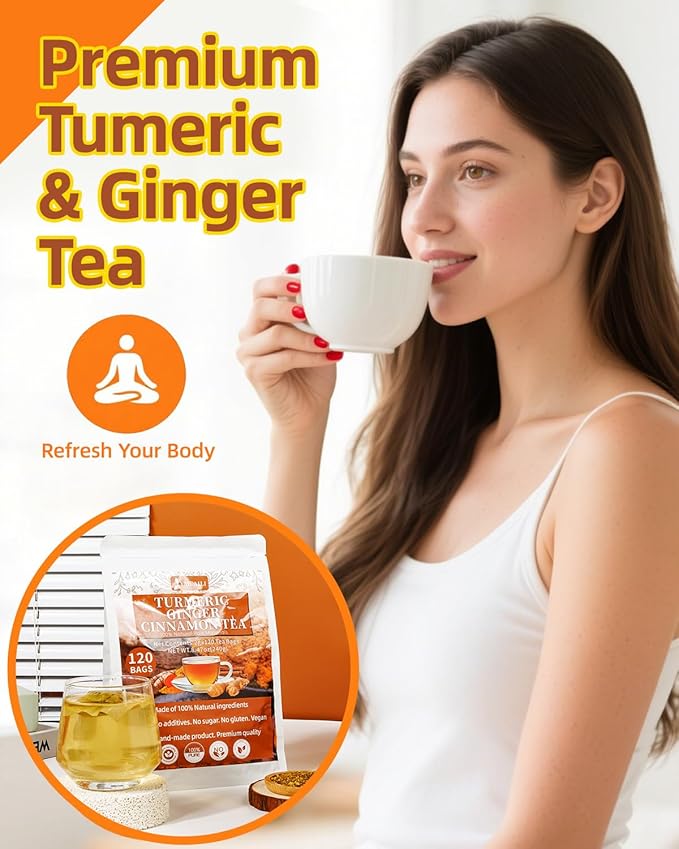 120 Premium Turmeric Ginger Cinnamon Tea Bags, 100% Natural Herbal Blend, Supports Digestion & Immune Health, No Sugar, No Caffeine, No Additives, Vegan, Premium Ingredients