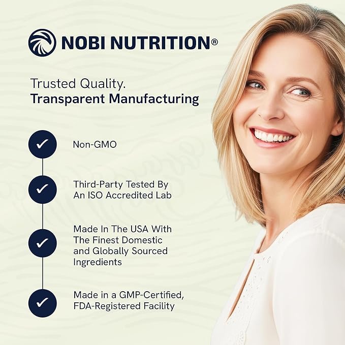 - TESTED, TRANSPARENT, TRUSTED: Third-Party Tested to ensure purity and potency. Manufactured in the USA in a GMP-certified facility, using premium domestic and globally-sourced ingredients. Based in Florida, Nobi Nutrition is a trusted American wellness brand, committed to quality, safety, full transparency, and customer satisfaction.