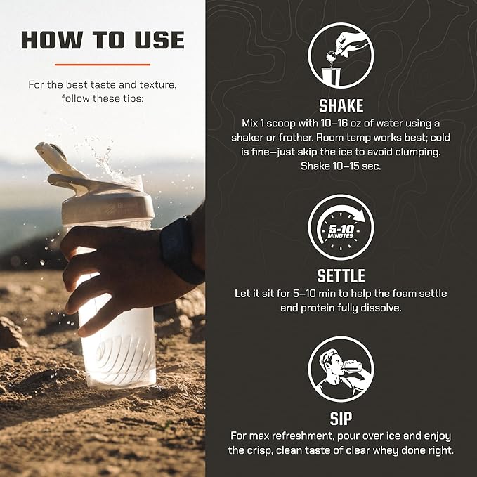 - MIX FOR BEST RESULTS: Shake 1 scoop of MTN OPS Magnum Clear Whey Protein in a shaker bottle or with a frother at room temperature for a smooth, clump-free clear protein drink. Always mix before adding ice to keep the texture light and refreshing.