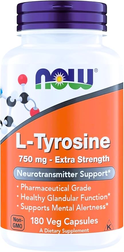 NOW Foods Supplements, L-Tyrosine 750 mg, Supports Mental Alertness*, Neurotransmitter Support*, 180 Veg Capsules