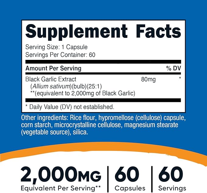 - Delivers 80 mg of aged black garlic at a 25:1 extract, which is the equivalent of 2,000 mg of black garlic