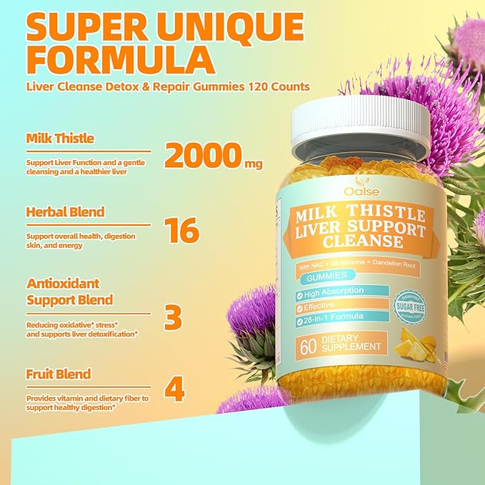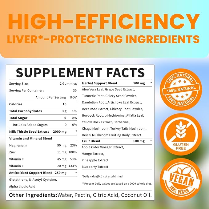 - The Ultimate Dose for Your Liver* - 2000mg Milk Thistle & 16 Herbal Extracts - Packed with 2000mg of premium Milk Thistle and a powerful blend of 16 natural herbs and fruits extract—including Turmeric Root, Dandelion Root, Grape Seed Extract, and more—our gummies provide unmatched support for your liver*’s detox* enzyme* system, promoting optimal liver* health and detoxifi cation*
