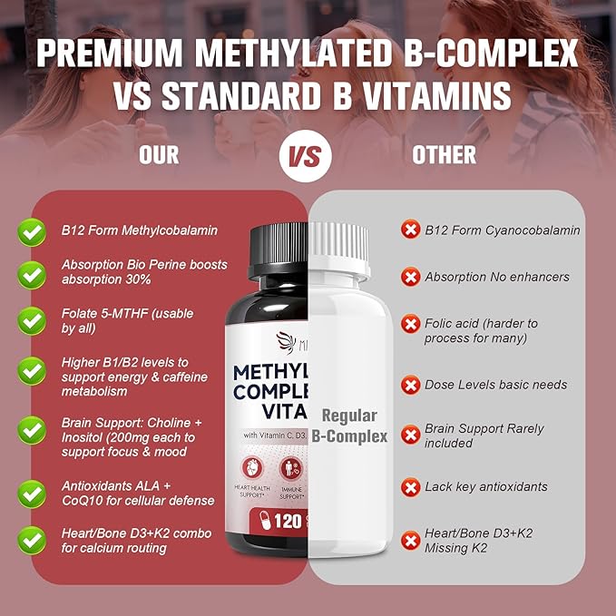 16-in-1 Methylated Multivitamin Plus, Methylated B Complex with Vitamin B12 & Methylfolate, B1-B7, CoQ10 & Alpha Lipoic Acid, Vitamin B Complex for Energy, Brain, Heart, Immunity& Antioxidant,120 Caps