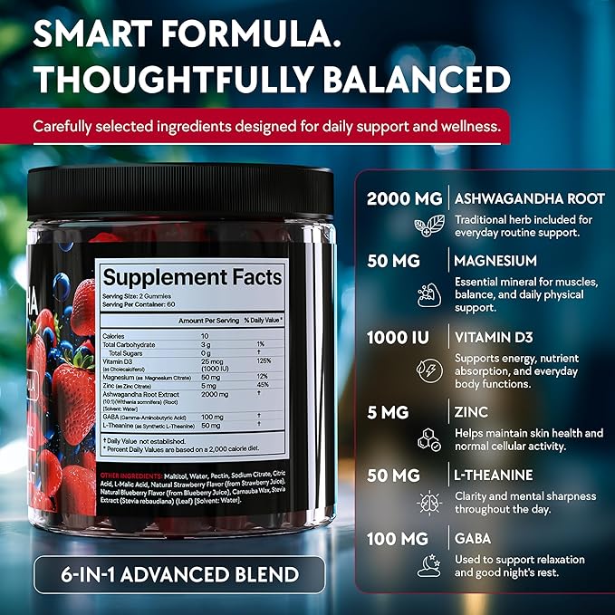 - Relax & Recharge: Amazing ashwa gummies with vitamin D3, magnesium & GABA support deep relaxation, a refreshed start in the morning & a balanced outlook for better daily performance