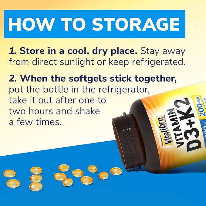 - How to Store: Keep D3 and K2 supplements in a cool, dry place. Stay away from direct sunlight or keep refrigerated. Put the bottle in the refrigerator when the vitamin d3k2 softgels stick together, take it out after 1-2 hours and shake it a few times, and the softgels will be separated.
