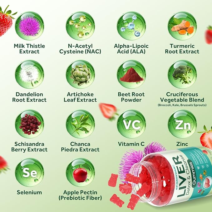 - Advanced Liver Support Formula: Features a powerful blend of Milk Thistle Extract, N-Acetyl Cysteine (NAC), Alpha-Lipoic Acid (ALA), Turmeric, Dandelion Root, Artichoke Leaf, Beet Root, Cruciferous Vegetables (Broccoli, Kale, Brussels Sprouts), Schisandra Berry, Chanca Piedra, Vitamin C, Zinc, Selenium and Apple Pectin, this milk thistle gummies support liver health, natural detoxification, digestive balance, immune defense, metabolic function, and daily energy