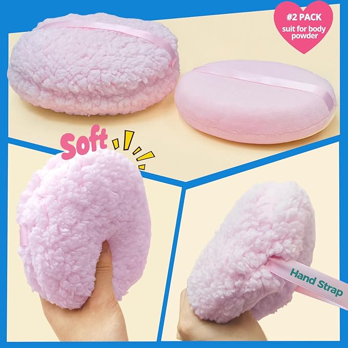 - Two Types of Fluffy, Soft Body Powder Puffs: The puffs are exceptionally soft, making powder application effortless. The 6-inch body dusting powder is crafted from soft texture with a skin-friendly surface, allowing it to pick up more dusting powder. The 5-inch body powder puff features a soft velour exterior and a cushiony sponge interior, paired with a smooth satin handle for a secure grip—enabling precise control while dusting. Each puff has a strong, well-sewn ribbon for durability.