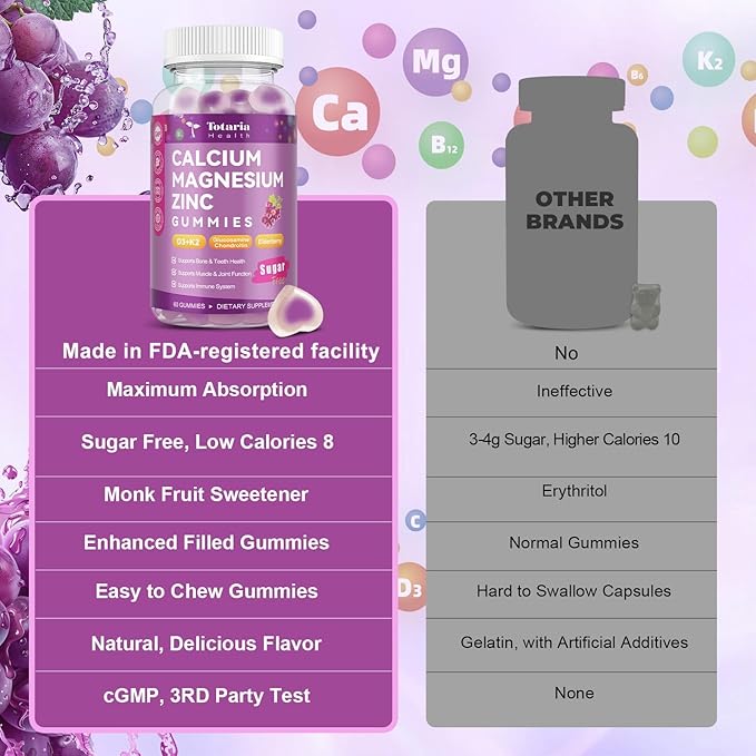 - Upgraded Calcium Supplements for Women and Men: Only two gummies a day deliver essential nutrients for strong bones, healthy joints, muscle relaxation, nerve support, and energy. Advanced filled-core technology helps lock in stability and ensure high nutrient bioavailability. Designed for convenience and maximum absorption—no pills, no sugar, no mess. Totaria makes daily bone support delicious, effective, and easy for everyone with busy, modern lifestyles.