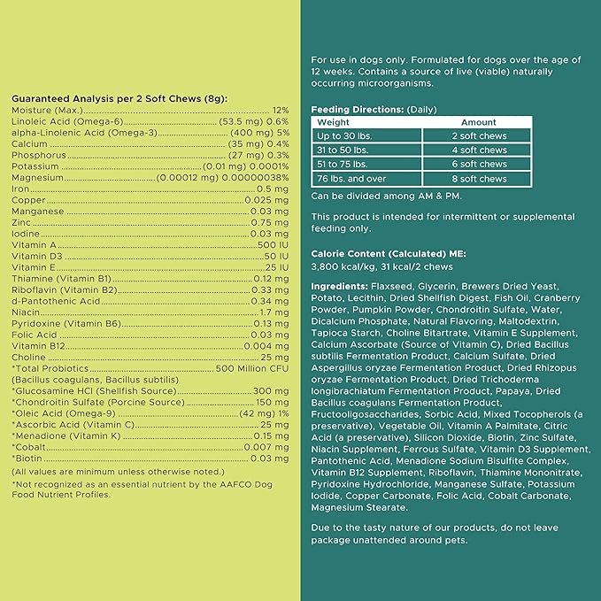 - There are 120 of our pet vitamin and supplement soft chews per bottle, each one has a delicious chicken flavor. Good for all breeds and for small, medium, and large dogs. See the packaging for serving recommendations.