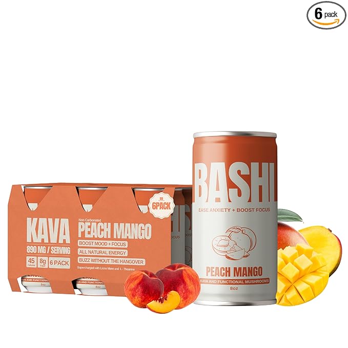 Bashi - Kava Drink Experience - Natural Relaxation & Stress Relief - Plant-Based Kava Extract - Non-Alcoholic, Caffeine Free - Peach Mango 8oz - 6 Pack