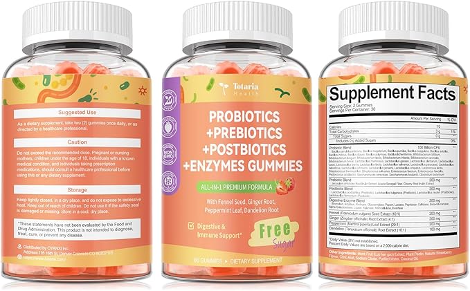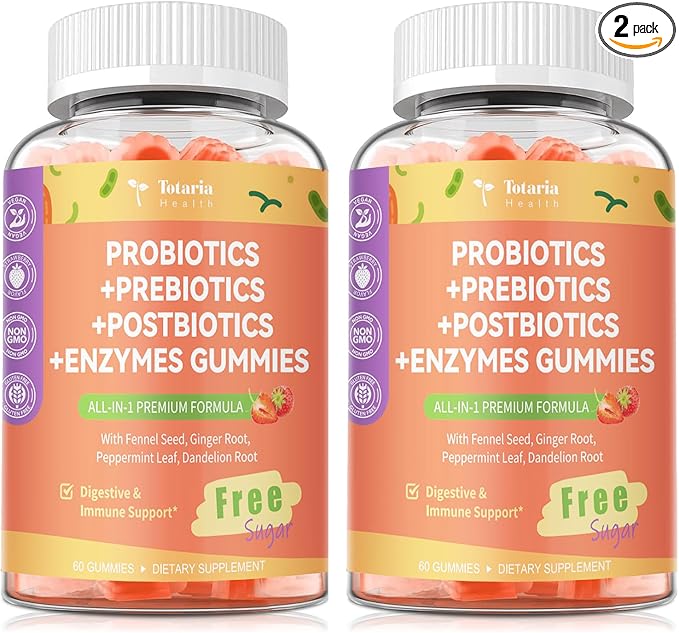 - Pre Post Probiotics Gummies 5-in-1: Totaria's Pre + Post + Probiotics Gummies combine the power of prebiotics (including inulin and fiber), probiotics, postbiotics, digestive enzymes, and potent herbs into one complete gut support solution. Every ingredient is carefully selected for its proven benefits in supporting digestive health and immune function.