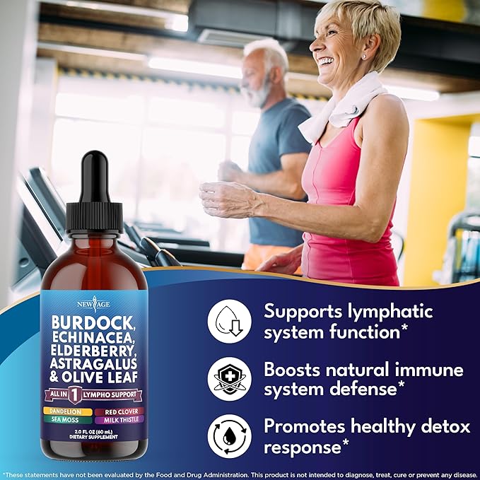 - Burdock Root For Liquid Lymphatic Drainage Drops - New Age Burdock all in one has the best ingredients like burdock root organic, echinacea tincture, organic elderberry, organic echinacea, dandelion root extract, olive leaf, ginger, red clover seed, horsetail, organic milk thistle and astragalus root offer the best lymph system support.