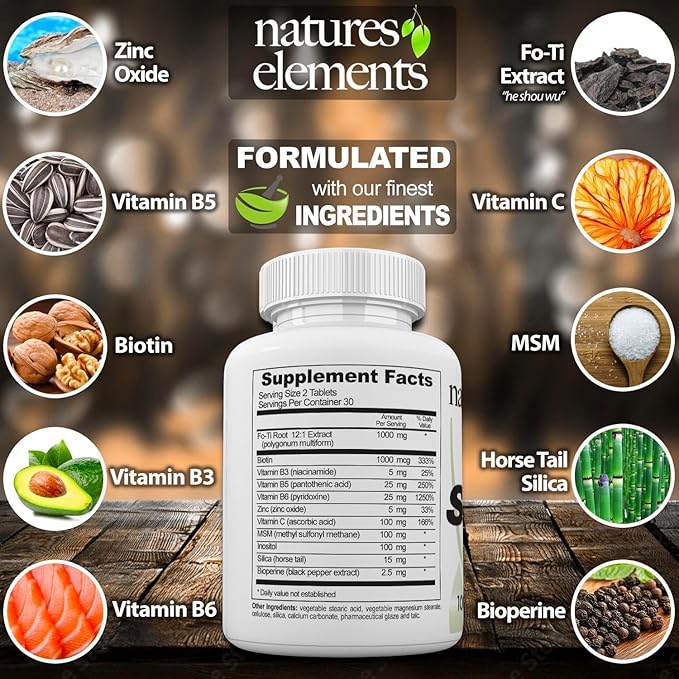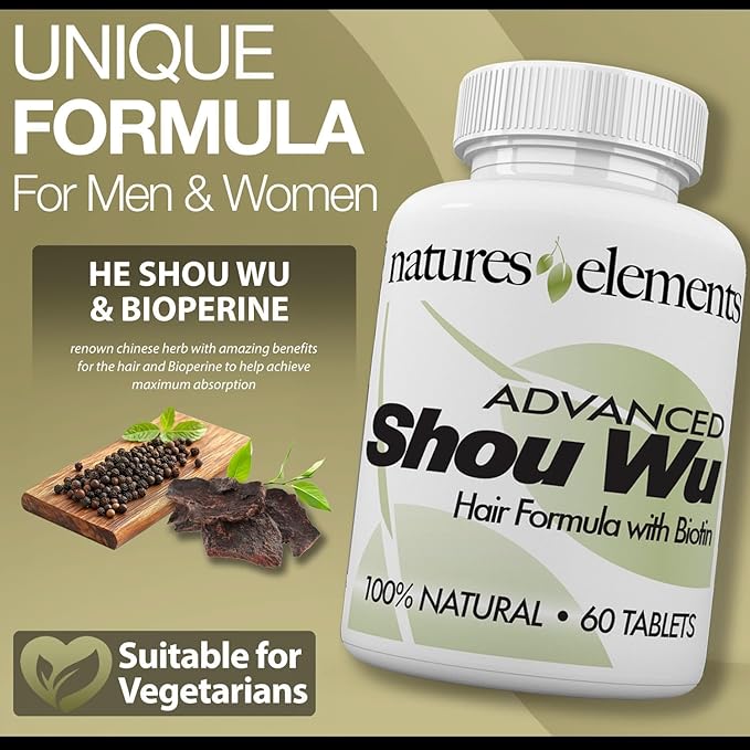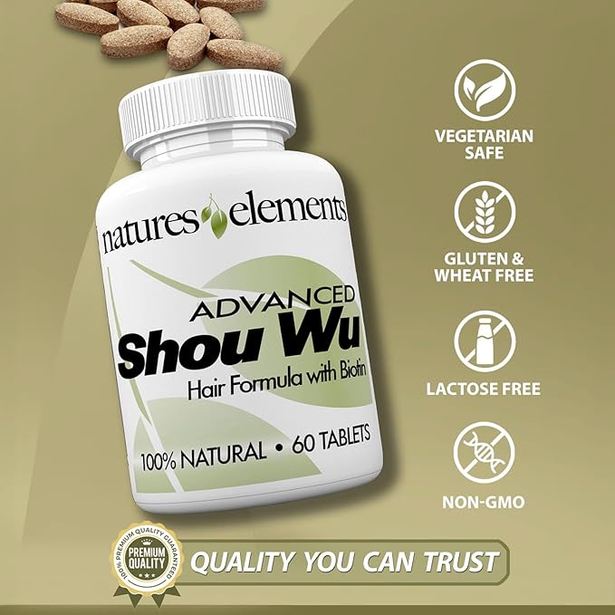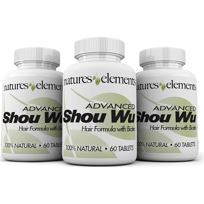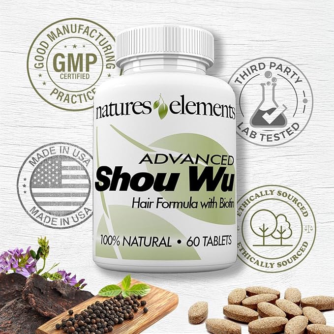 Natures Elements Advanced Shou Wu for Gray Hair – Prepared He Shou Wu for Hair Growth with Biotin, Bioperine, Fo-Ti Root & More – 100% Natural – 60 Tablets – Pack of 3 - Non-GMO, Gluten-Free