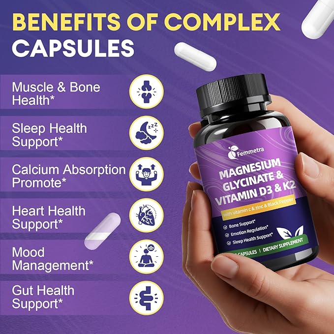 - 9-IN-1 PREMIUM FORMULA: Our advanced blend combines 600mg magnesium glycinate, vit d3 and k2 with zinc, vitamin C, L-theanine, and melatonin to deliver comprehensive support. Enhanced with black pepper extract for better absorption, this formula targets bone strength, relaxation, and sleep health—perfect for active adults seeking a smarter daily supplement.