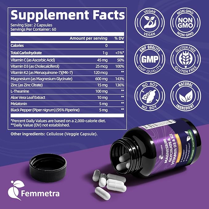 - TRUSTED & EXCELLENT QUALITY: Each of Femmetra's capsules is backed by rigorous testing for purity and potency, ensuring the highest quality and efficacy. This product is vegan, gluten-free, Non-GMO and sugar-free, safe to take. For better results, please take two(2) capsules once daily. If you have any questions about your purchase, please contact us and we will give you the most satisfactory reply!