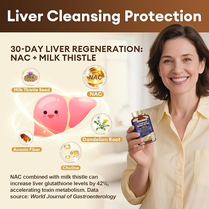 - Liver Cleansing: NAC, Milk Thistle, Dandelion Root, Acacia Fiber, Choline 5 liver cleansing ingredients promote liver detoxification and relieve the burden of chemical toxins such as alcohol and staying up late. Solve the problem that liver fatigue can easily lead to poor skin and fatigue.