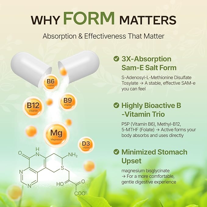 - This complex includes SAM-e together with Vitamin B6 (P5P), Vitamin B9 (5-MTHF), and Vitamin B12 (Methylcobalamin), along with Magnesium (as Magnesium Glycinate). It is provided in capsule format, combining these ingredients in a single daily serving.